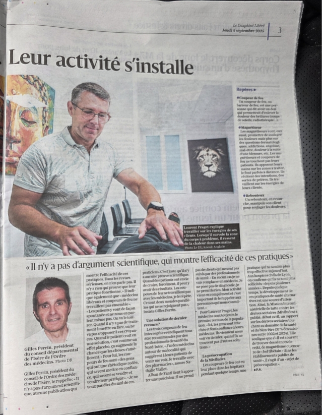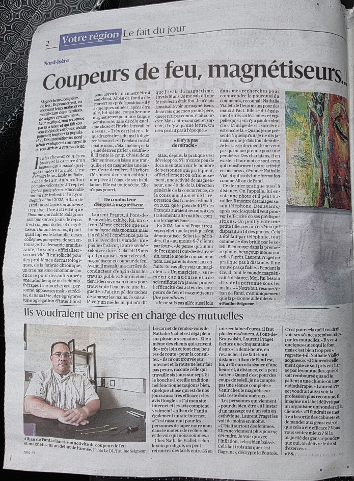 Je tiens à remercier le Dauphiné Libéré pour cet article intitulé « Coupeurs de feu, magnétiseurs... leur activité s'installe », paru ce jour. ​J'apprécie la qualité de ce reportage qui a su aborder ce sujet complexe avec un grand professionnalisme et une approche équilibrée, en présentant à la fois les témoignages de praticiens du Nord-Isère dont je fais partie et l'avis du corps médical. Nous espérons être reconnu par les mutuelles pour une future prise en charge. Il est rare de voir ce sujet abordé sans préjugés, et cet article a réussi à présenter de manière objective les différents points de vue, offrant ainsi une information complète et respectueuse de chacun. C'est une démarche très appréciable, grâce à vous, médias et réseaux, vous contribuez à l'ouverture d'esprit sur nos pratiques